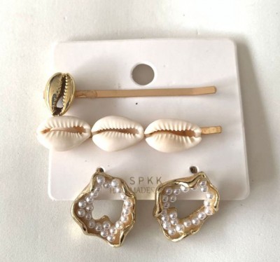 KIT COM 02 PRESILHAS DE CABELO E 01 PAR DE BRINCOS COM BUZIOS E PEROLAS - NOVO - COD1610