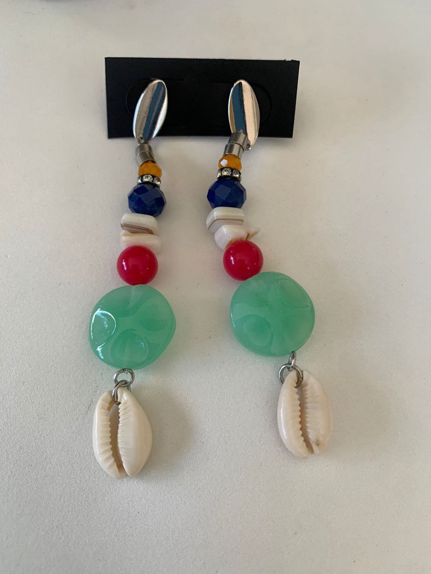 PAR DE BRINCOS - PRATEADO - PEDRAS COLORIDAS E BUZIOS - COD1552