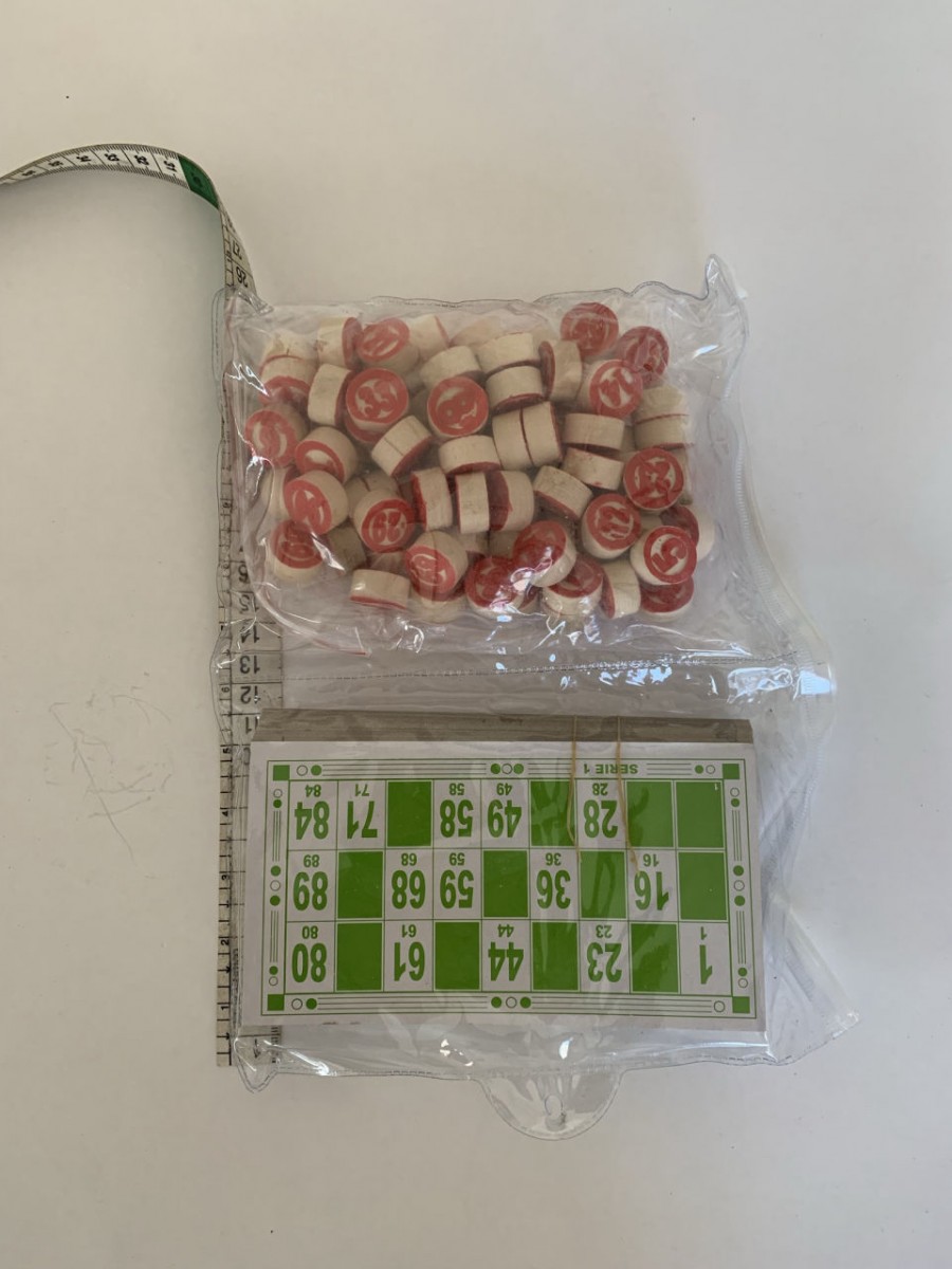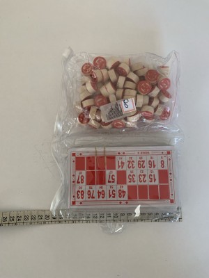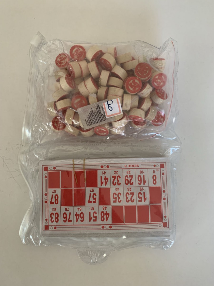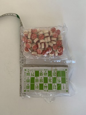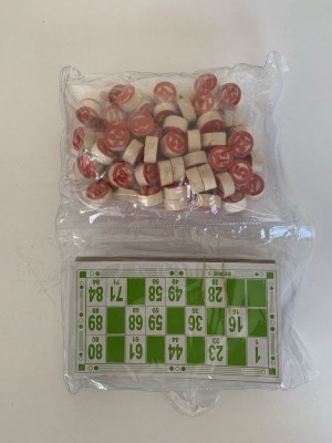 CONJUNTO COM CARTELAS 16X11CM E PEÇAS COM NÚMEROS PARA BINGO - EM ESTADO DE NOVO