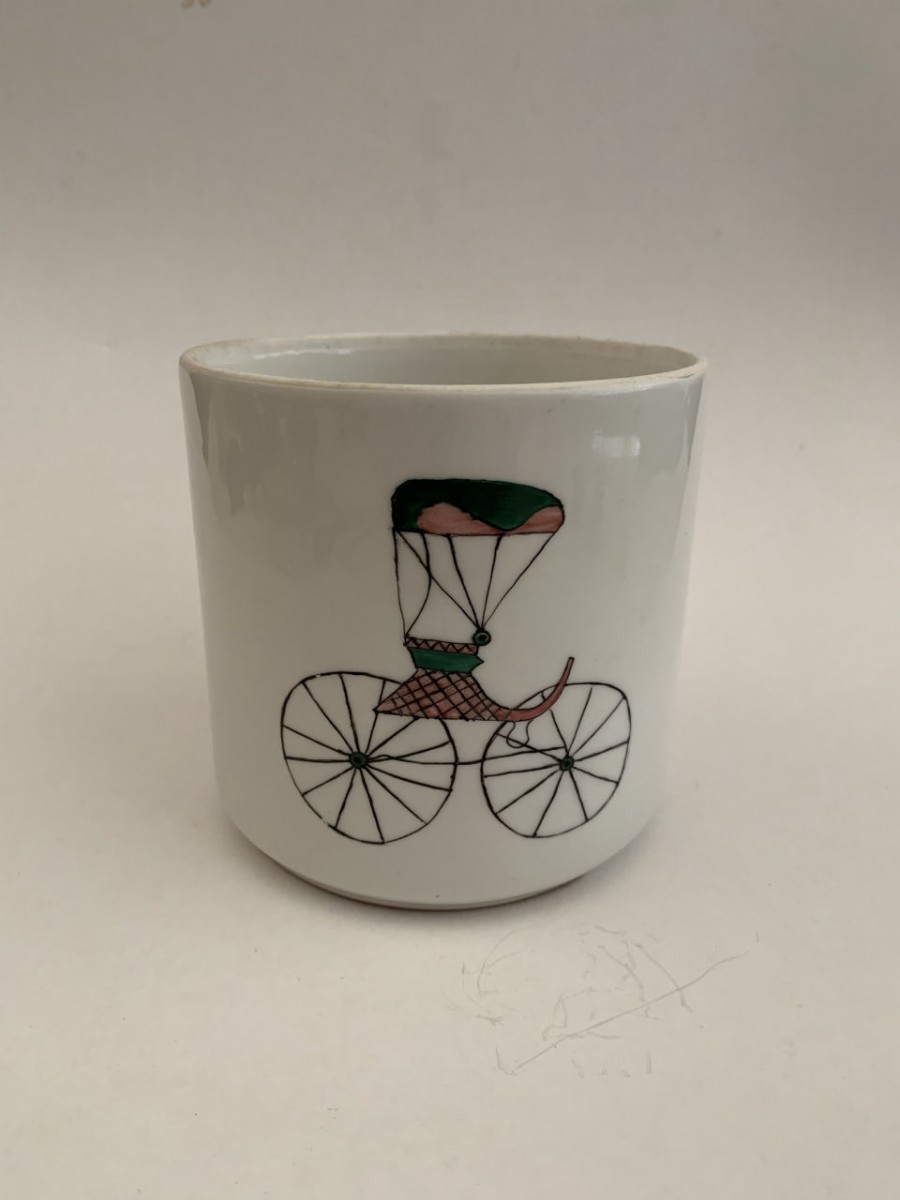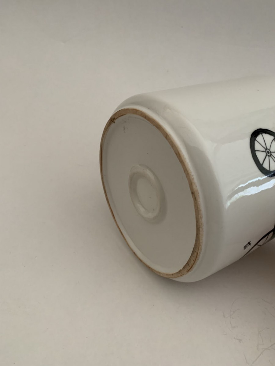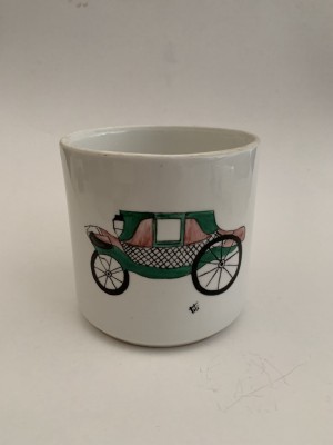 CANECA DE PORCELANA COM PINTURAS REPRESENTANDO CARROS ANTIGOS EM POLICROMIA - 11CM X 11,5CM DE DIÂMETRO - EM BOM ESTADO