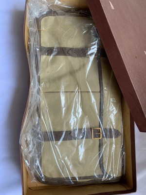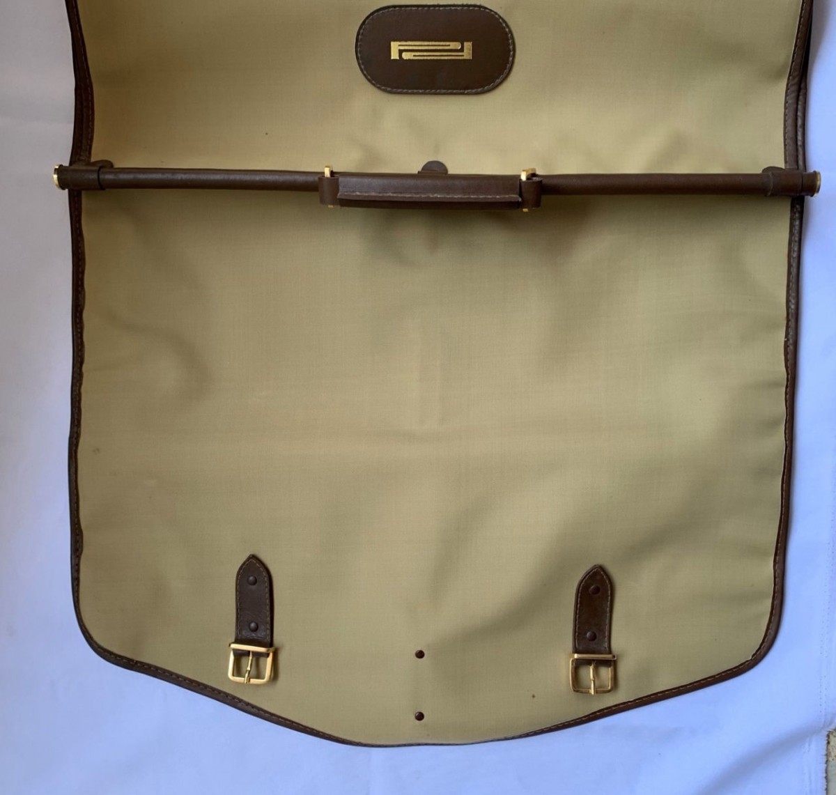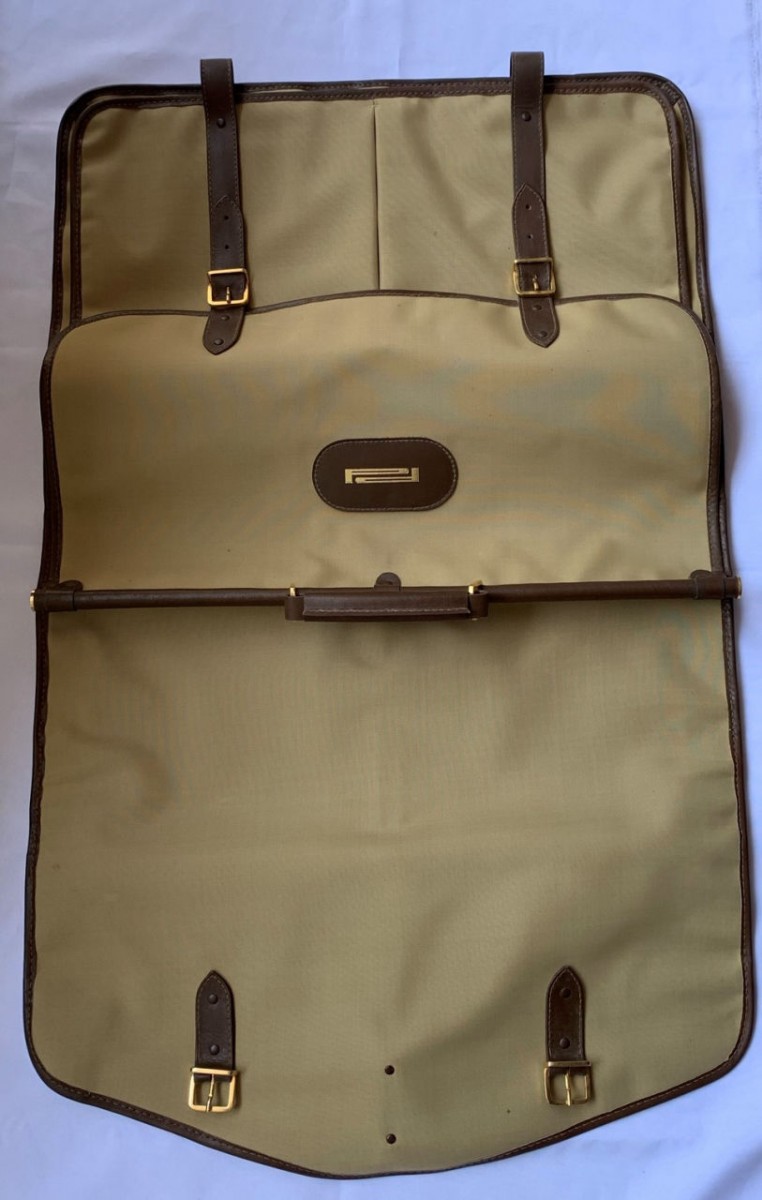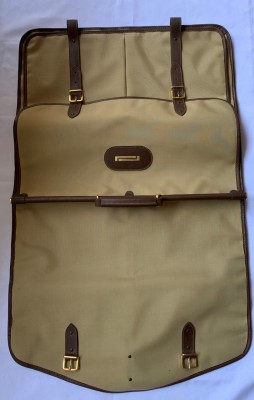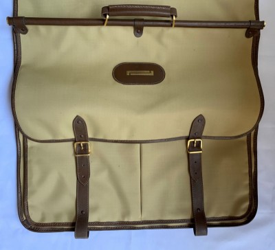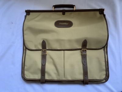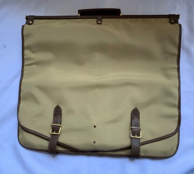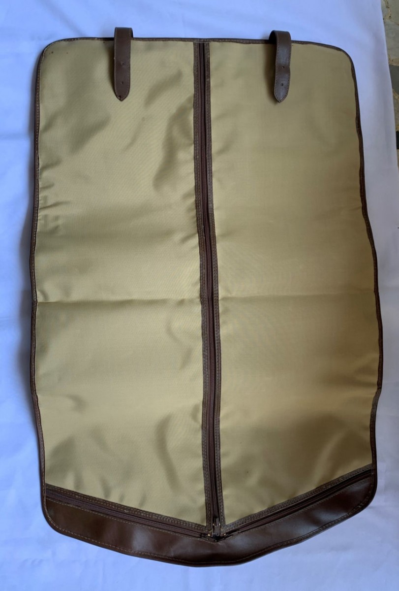 MALA PORTA TERNO EM LONA CAQUI COM ZÍPER E TIRAS DE COURO MARROM - COM DISCRETAS MARCAS DO TEMPO NO COURO - NUNCA USADO, GUARDADO NA CAIXA