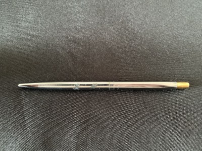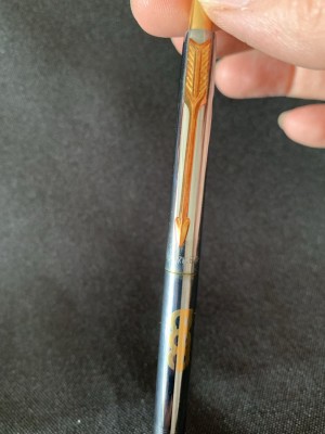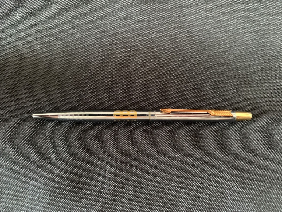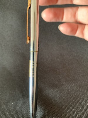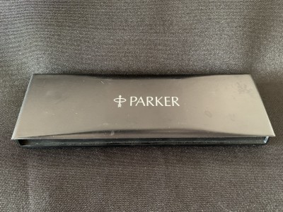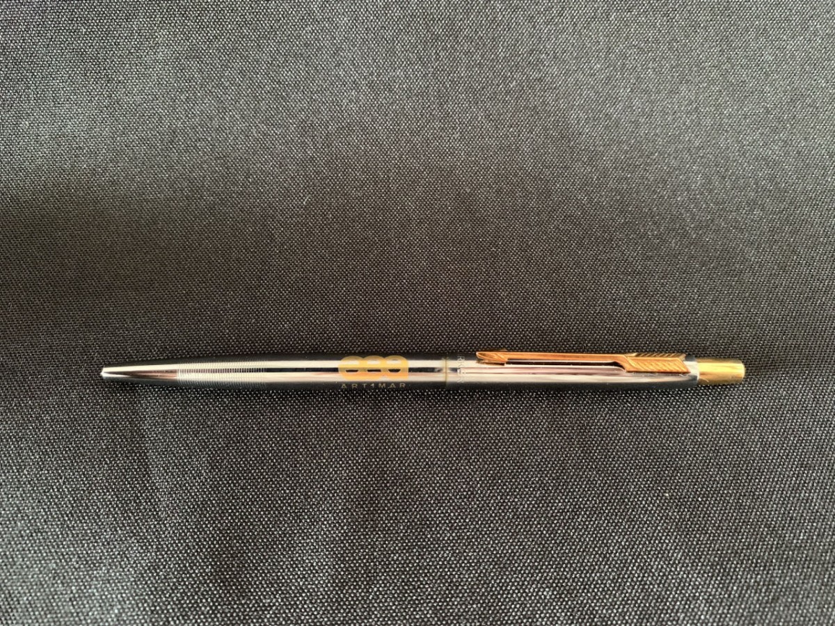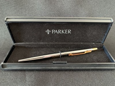 PARKER - CANETA ESFEROGRÁFICA PROMOCIONAL "ARTIMAR" - NECESSIDA NOVO BANHO CHUMBO CLARO - BOTÃO EVENTUALMENTE TRAVA - 13,5CM DE COMPRIMENTO - SEM CARGA - ORIGINAL, USADA, COM MARCAS DE USO, NO ESTOJO E EM BOM ESTADO