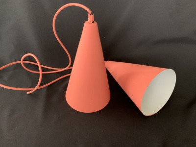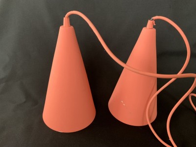 PAR DE LUMINÁRIAS TERRACOTA E BRANCAS. 15,5 DE DIÂMETRO DA BOCA E 26CM DE ALTURA, APRESENTAM PEQUENOS PONTOS DE DESGASTE NA TINTA, NÃO TESTADAS