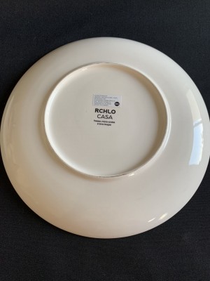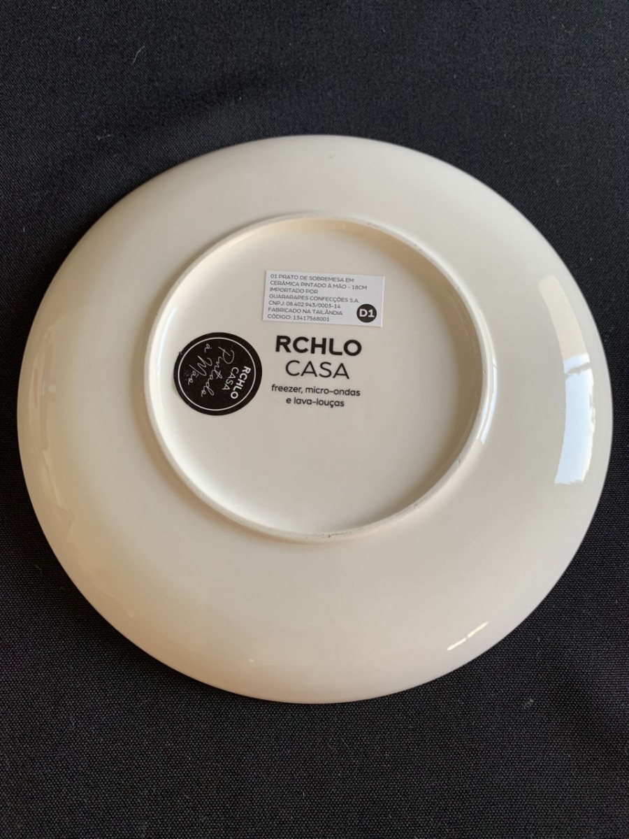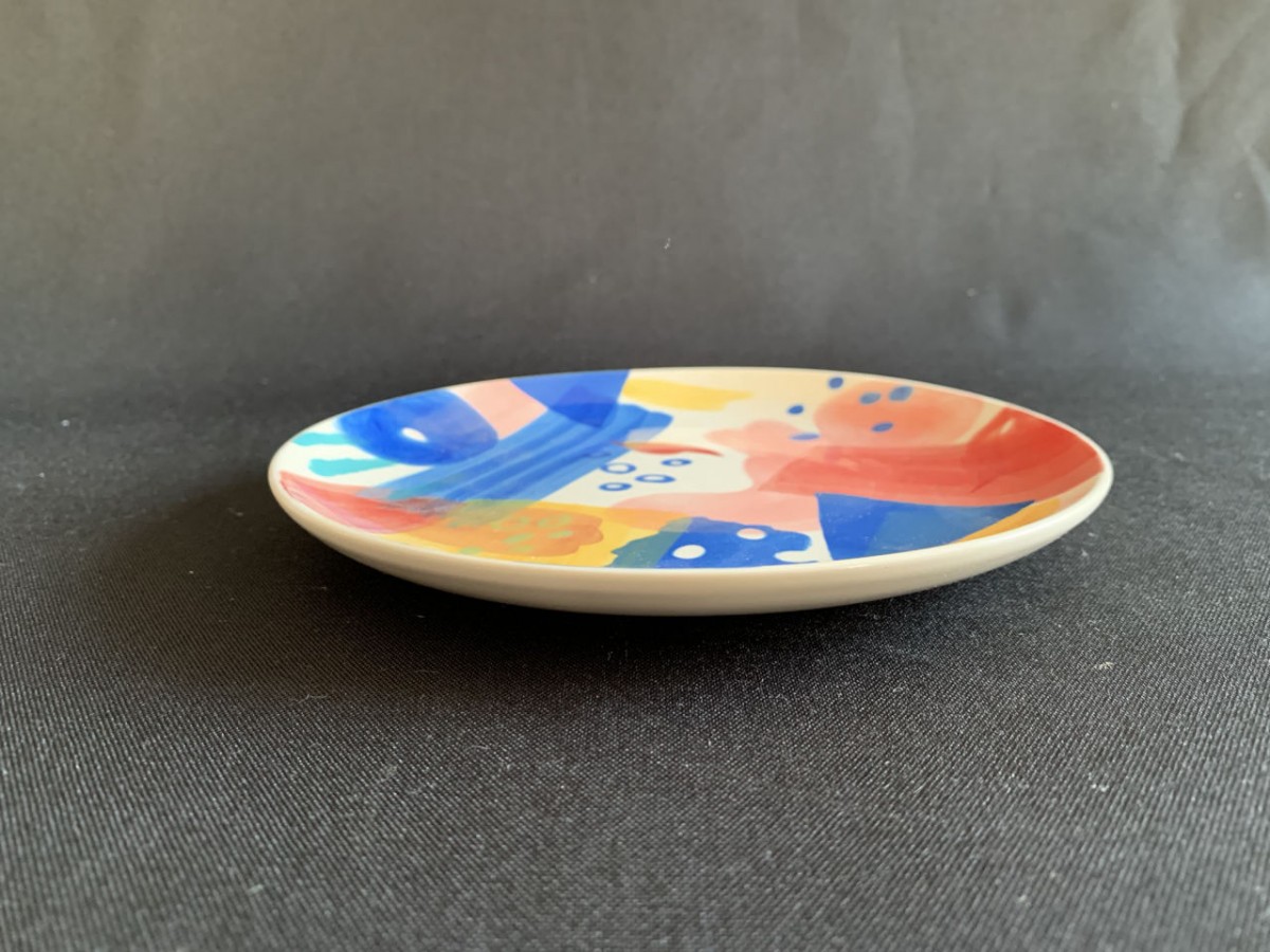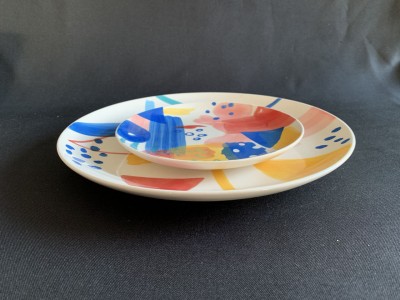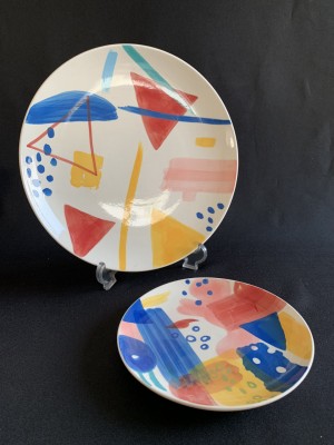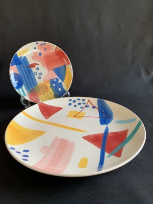 CONJUNTO COM 02 PRATOS DE CERÂMICA PINTADO À MÃO, NOVOS, NUNCA USADOS, COM DECORAÇÃO ABSTRATA COLORIDA. 27CM E 18CM DE DIÂMETRO