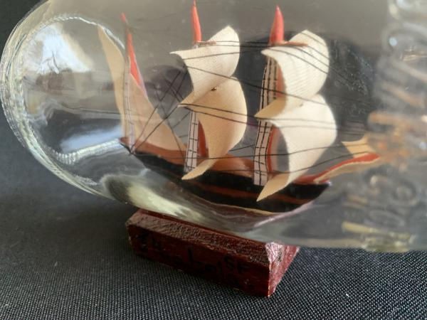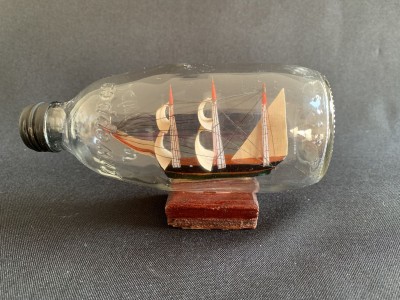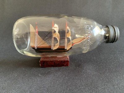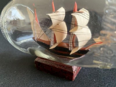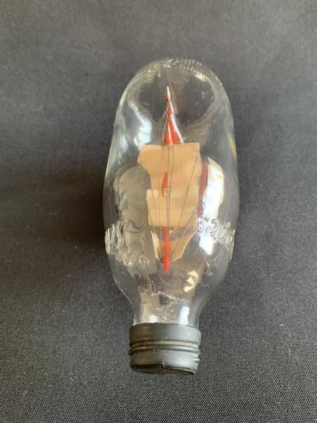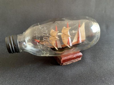 PEQUENA GARRAFA DECORATIVA DE VIDRO COM CARAVELA INTERNA. SOUVENIR DE ILHABELA. 15CM X 8CM E 9CM DE ALTURA. APRESENTA MARCAS DO TEMPO