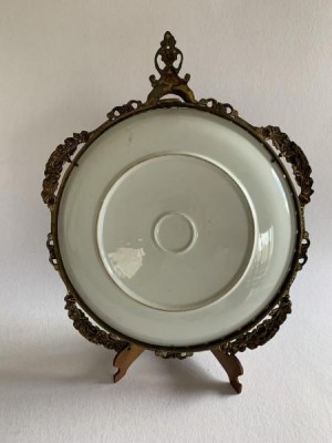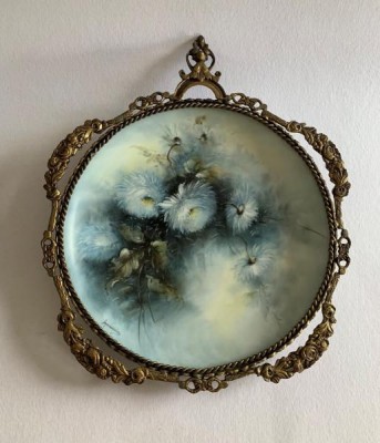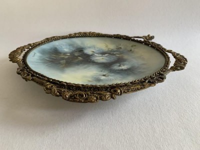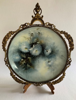 APARECIDA VALLE (1925-2008) - GRANDE PRATO DE PORCELANA COM MOLDURA DE BRONZE TRABALHADA. PORCELANA PINTADA À MÃO EM FINA POLICROMIA FLORAL EM TONS AZUL E BRANCO. 41CM X 34CM, EM ÓTIMO ESTADO. ASSINADO NA PARTE INFERIOR À ESQUERDA.