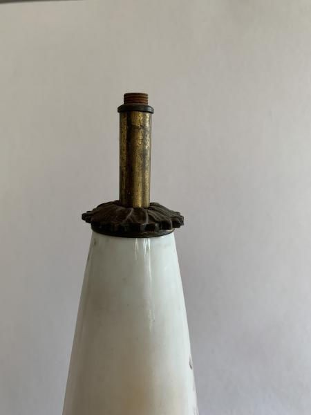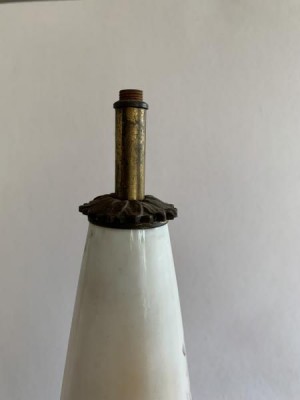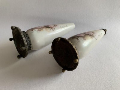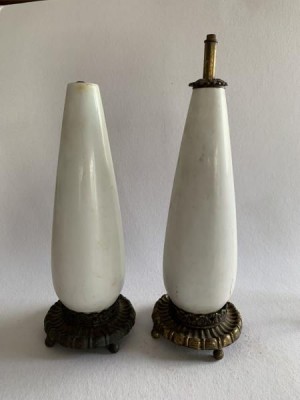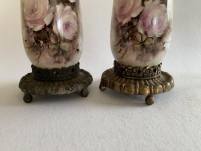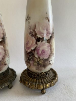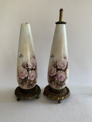 APARECIDA VALLE (1925-2008) - ANTIGO PAR DE ABAJUR COM BASE EM BRONZE E CORPO DE PORCELANA PINTADA EM POLICROMIA FLORAL EM TONS ROSA. 36CM DE ALTURA E 12,5CM DE DIÂMETRO NA BASE, UMA DAS UNIDADES ESTÁ SEM O TOPO E APRESENTA MARCAS